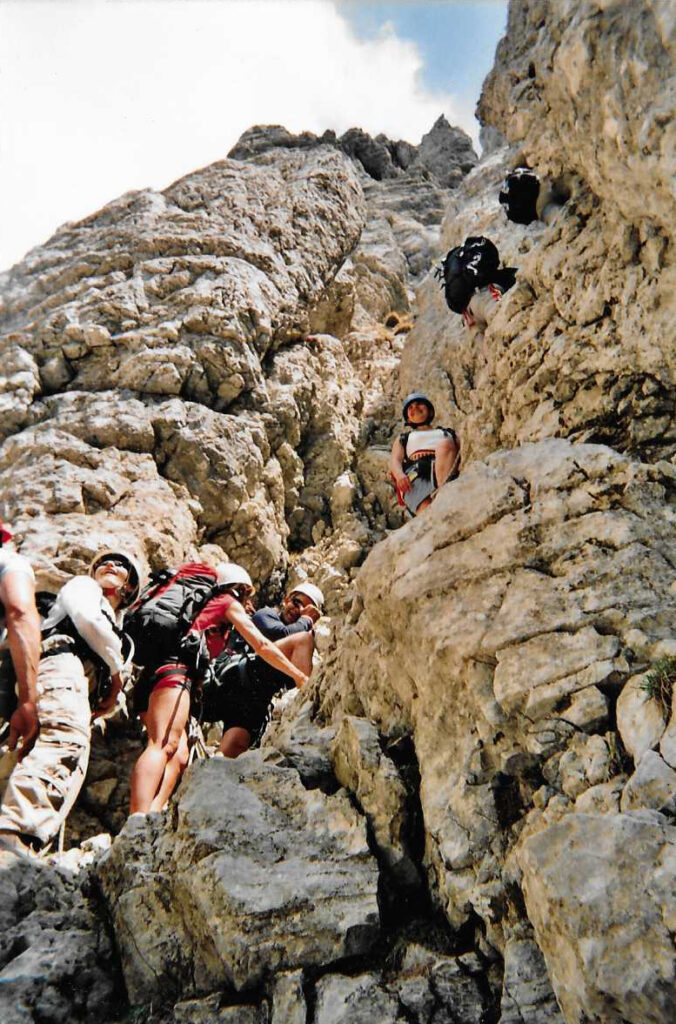 – dimanche 7 juin : rando sur un chemin forestier jusqu’au pied de la paroi (1h45). S’équiper sur les conseils de Laurent, notre guide. Nous sommes 4 sur sa corde. Grimpe en cheminant entre gros blocs, cheminée, vires, câbles et arrivée au sommet(1h30).